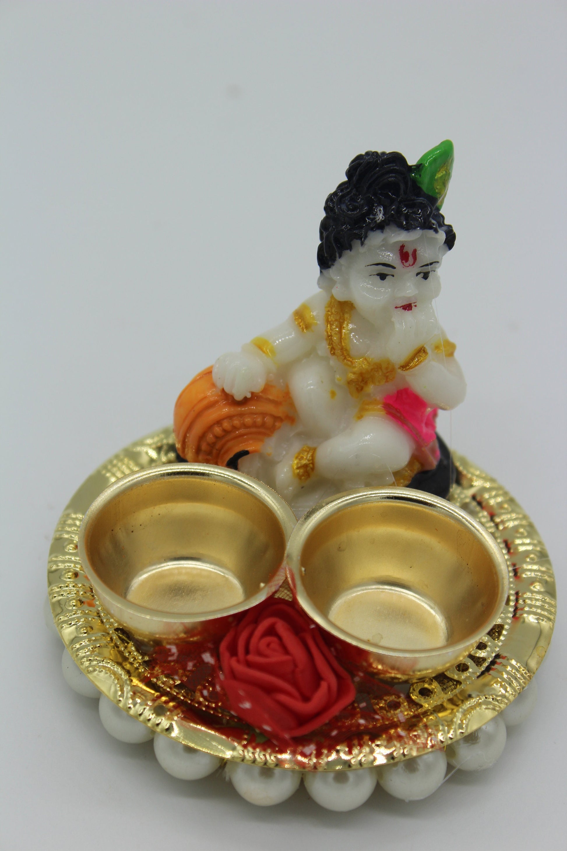 - Two compartments for haldi kumkum on an elegant plate with lord Krishna.